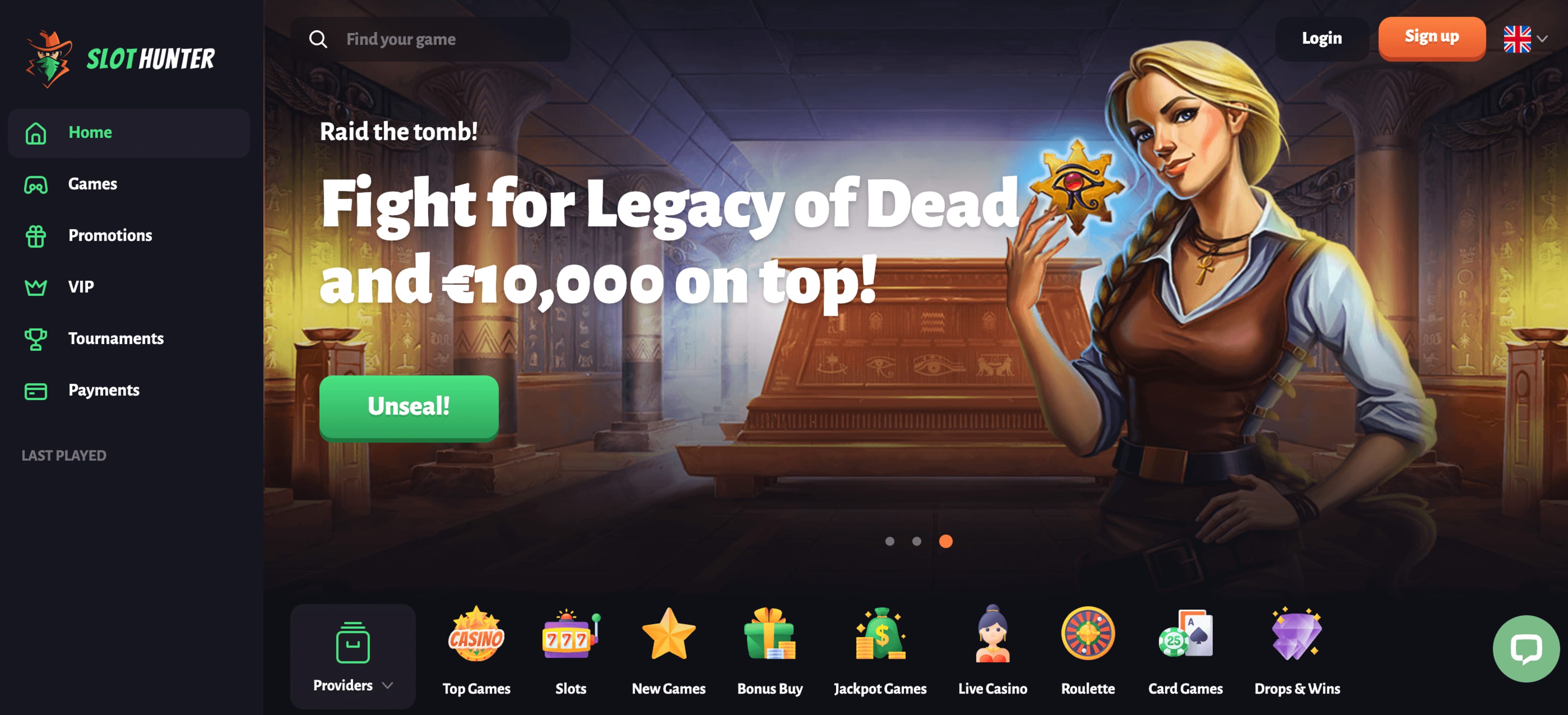 Slot Hunter is an online casino that operates under license from the Malta Gaming Authority. With a unique black, white, and neon green aesthetic, Slot Hunter is a stylish mobile-ready casino that has a little something to offer all gamblers in Canada.